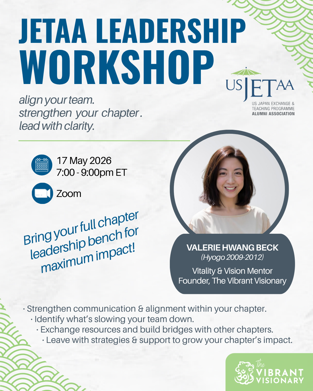 Valerie Hwang Beck is a Vitality & Vision Mentor and founder of The Vibrant Visionary, where she guides individuals and groups through complex life and leadership transitions. She is also an active member of the JETAA Tokyo community, where she currently serves as Communications Officer, and past Social Chair of JETAA SoCal, which means she brings both professional expertise and firsthand experience of the challenges JETAA leaders navigate every day.